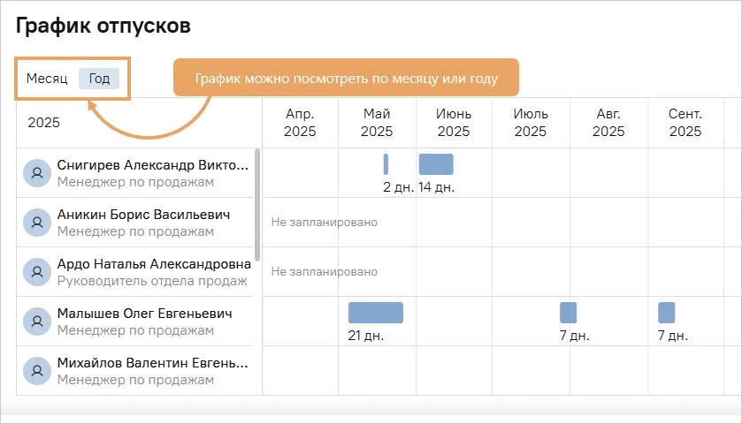 Функциональность помогает автоматически формировать график отпусков, быстро согласовывать его, а затем при необходимости оперативно переносить дни отдыха. Для малого и среднего бизнеса эта тема часто бывает болезненной: взаимозаменяемых сотрудников немного, каждый хочет уехать в лучшие дни сезона. Как следствие — обсуждение графика затягивается вместе с составлением плана, кадровики и персонал тратят рабочее время, пока «путешествуют» в кабинеты друг друга, чтобы договориться. Отдельная задача — скорректировать график: на бумаге или в таблице Excel кадровому специалисту приходится вручную менять все данные.