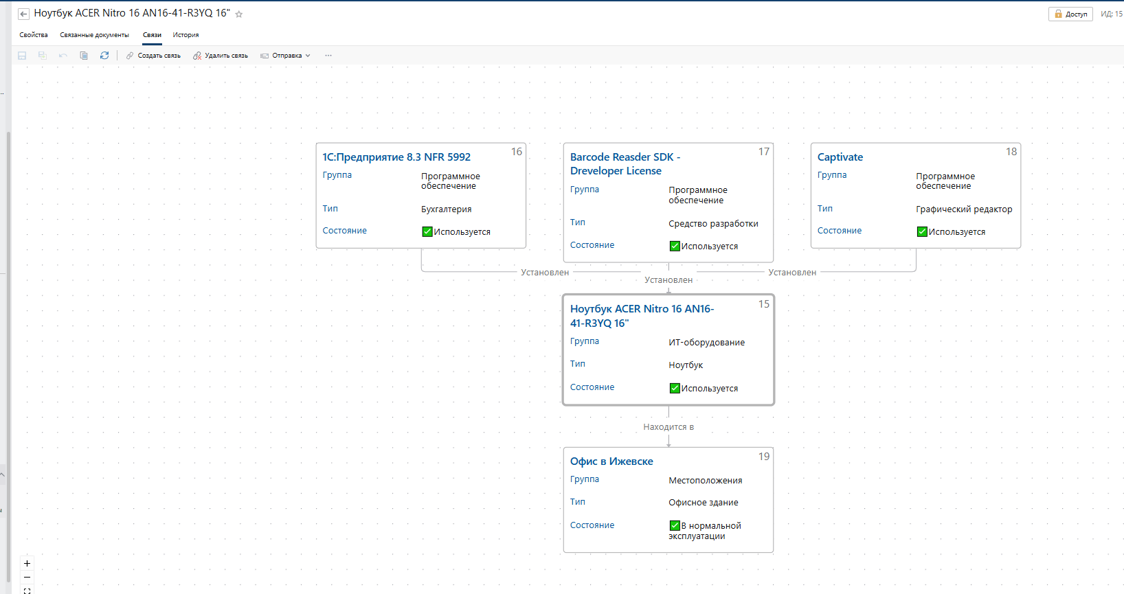 Например, ноутбук Павла Снигирева связан с кабинетом № 223, кабинет связан со 2-м этажом, этаж связан с офисом в Ижевске на улице Ленина.