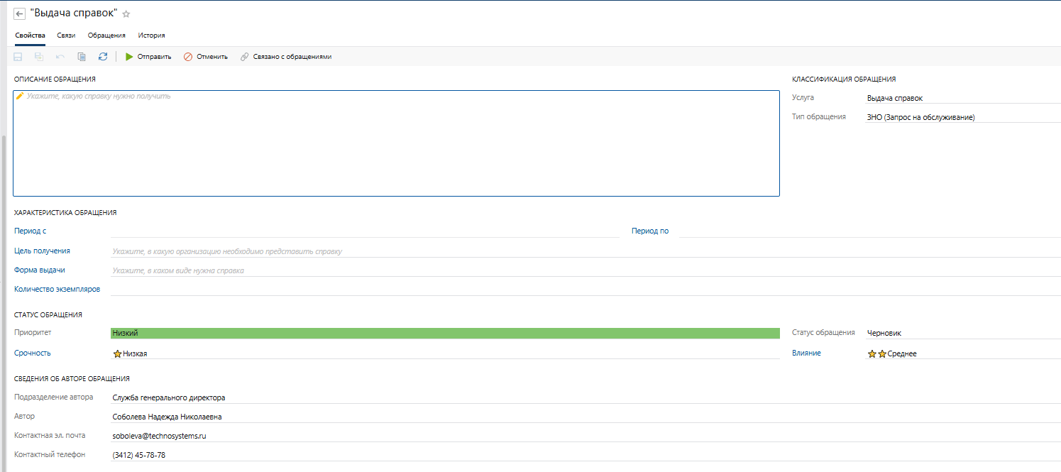 Для рядовых сотрудников на обложке решения находится главная кнопка «Отправить Обращение». Также работник может послать запрос за своего коллегу, например, если у второго сломан ПК.