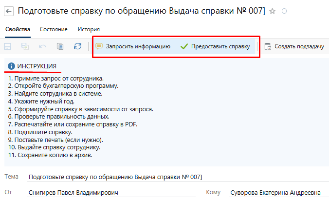 У исполнителей обращений есть возможность запросить дополнительную информацию от инициатора, изучить «Инструкцию по своему плану действий» и т.д. А если вы итоговый исполнитель заявки, то после нажатия кнопки «Предоставить справку» задача будет считаться выполненной.