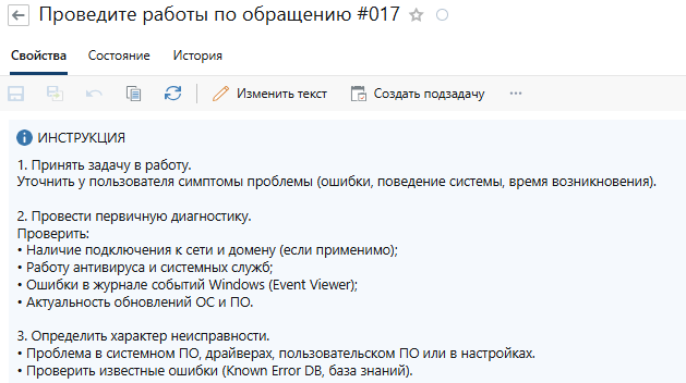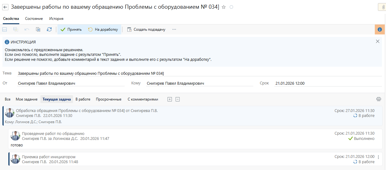 После выполнения обращения можно настроить задание на приемку работ, чтобы у инициатора запроса была возможность написать комментарий или отправить заявку на доработку.