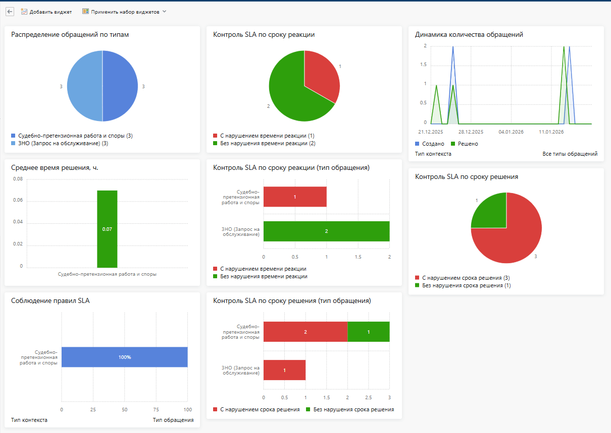 У руководства всегда есть возможность отслеживать динамику по обращениям на виджетах: посмотреть количество заявок по типам, нарушения сроков, среднее время решения. Это поможет найти узкие места в исполнении заявок и быстро улучшить процесс.