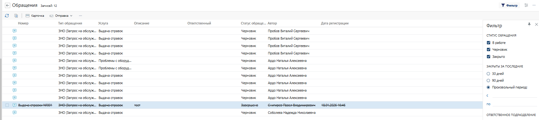 Здесь же ответственные сотрудники могут перейти в главный реестр «Обращения» и сделать удобную фильтрацию по типам или авторам.