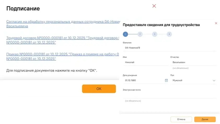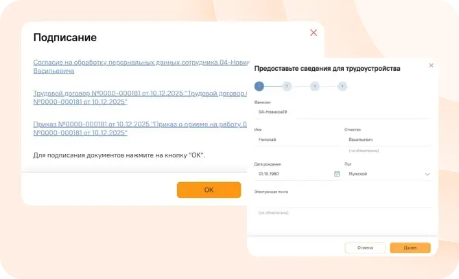 Кандидат подтверждает личность через Госуслуги и подписывает трудовой договор в электронном виде — для этого не нужно приезжать в офис. Все документы остаются доступны вам и сотруднику онлайн. Нанимайте сотрудников по всей России: быстро, без бумажной волокиты и пересылок.