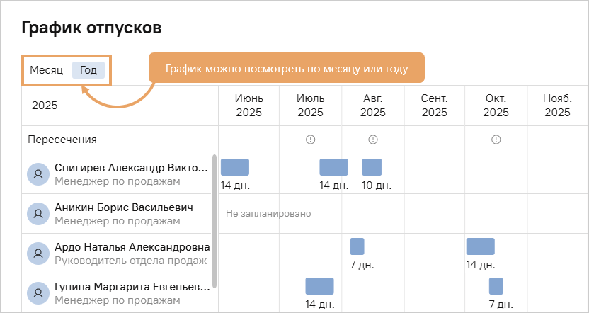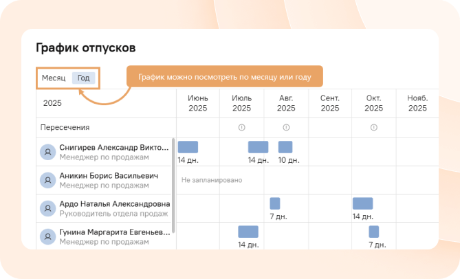 Система сама разошлет задания на планирование отпуска сотрудникам, соберет все данные в график и подсветит пересечения. Отправить заявление на перенос отдыха работник сможет онлайн с любого устройства. Бухгалтерия рассчитает отпускные вовремя, а отсутствие коллеги не будет сюрпризом.