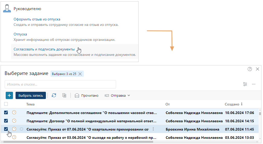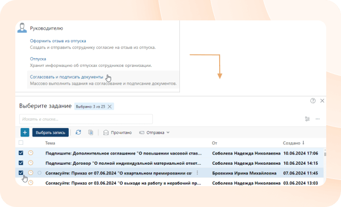 Руководитель массово подписывает документы за пару минут. Кадровый специалист отправляет приказы удаленным и офисным сотрудникам по правилам вашей компании. Работники получают уведомления в личном кабинете. Контролировать подписание можно онлайн с помощью листа ознакомления.