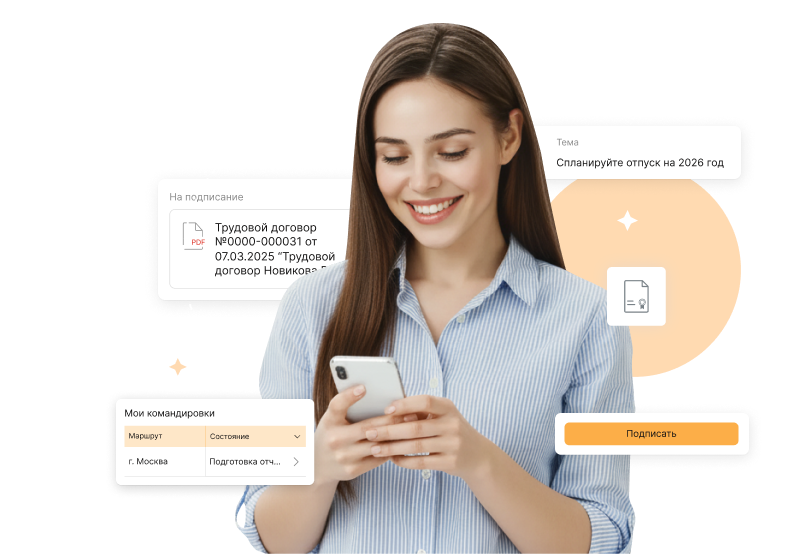 Подписывайте документы, принимайте на работу, оформляйте командировки и отпуска — онлайн. Выгодно бизнесу, удобно для сотрудников.
