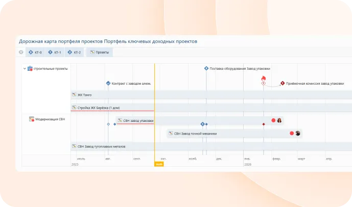 Визуально отображайте контрольные точки и их связи с проектами на Дорожной карте. Это поможет наглядно оценить промежуточный результат и управлять изменениями, которые влияют на несколько проектов сразу.