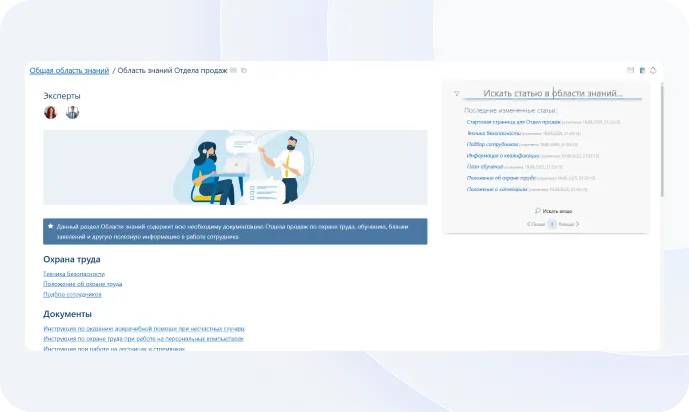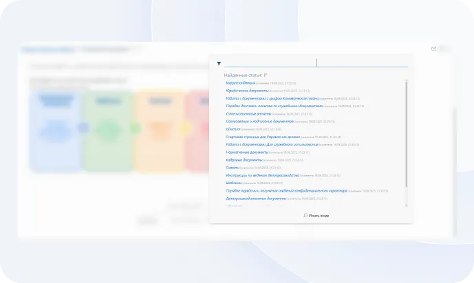 Организуйте Базу знаний для хранения всего накопленного опыта компании: инструкций, регламентов, практических кейсов. Так вы сможете быстро находить нужную информацию в системе, эффективно применять корпоративный опыт, исключите дублирование и использование устаревших данных.