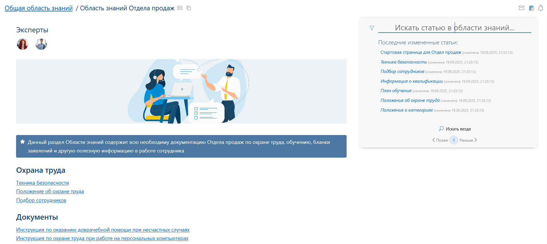 Распределяйте статьи по областям знаний для отделов или проектных групп.