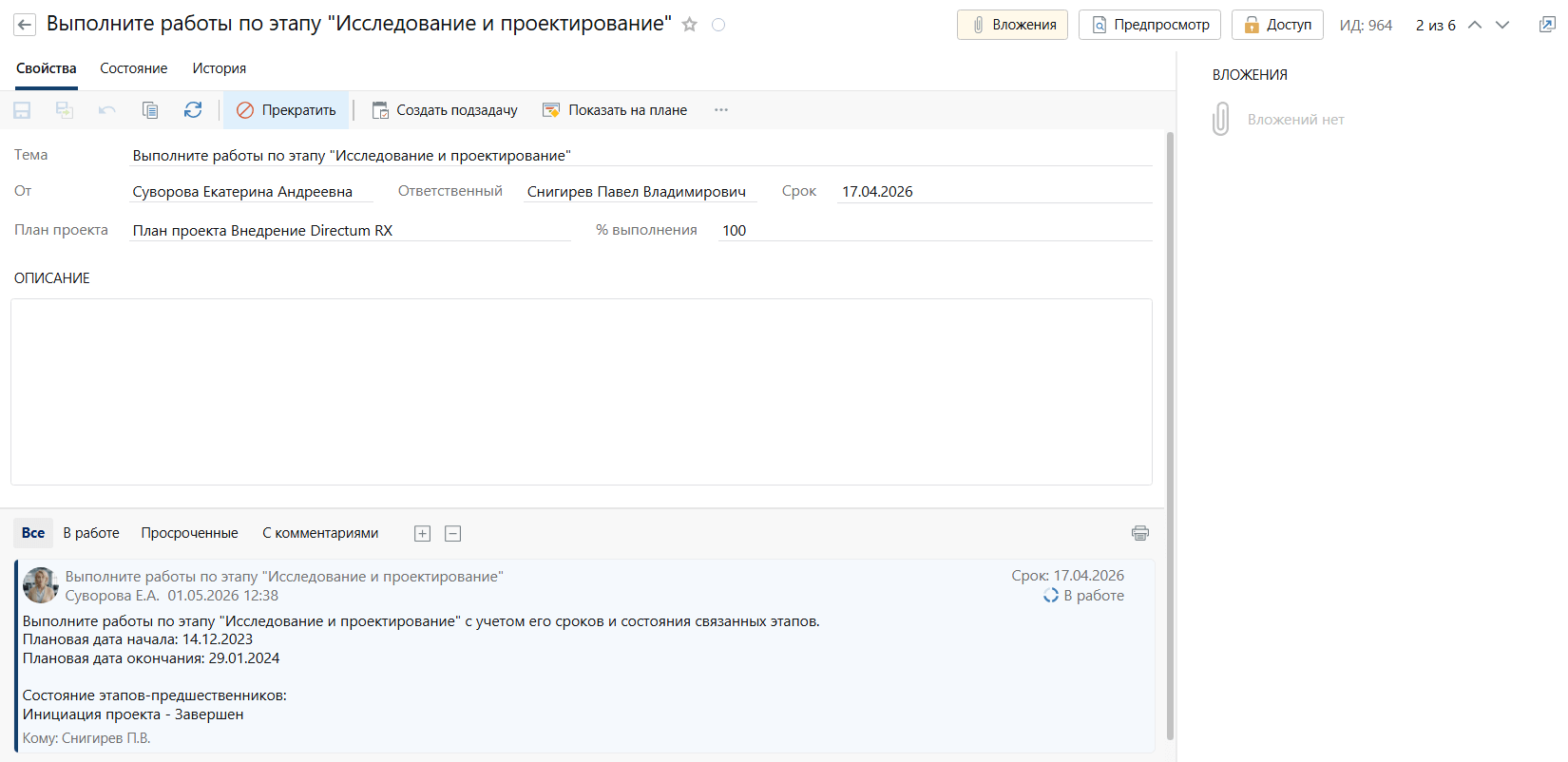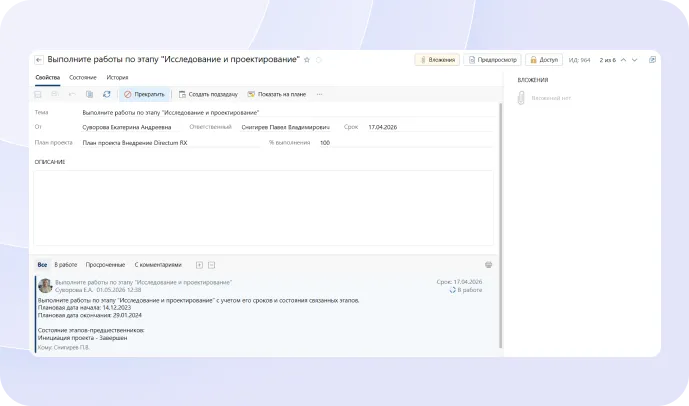 Отслеживайте выполнение работ по проекту. Задачи отправляются исполнителю автоматически из плана проекта. Ответственный может отчитаться о выполнении этапа прямо в задаче, приложив документы и заполнив факт работ. Завершенная задача придёт на контроль руководителю проекта, а результаты выполнения отобразятся на диаграмме Ганта.